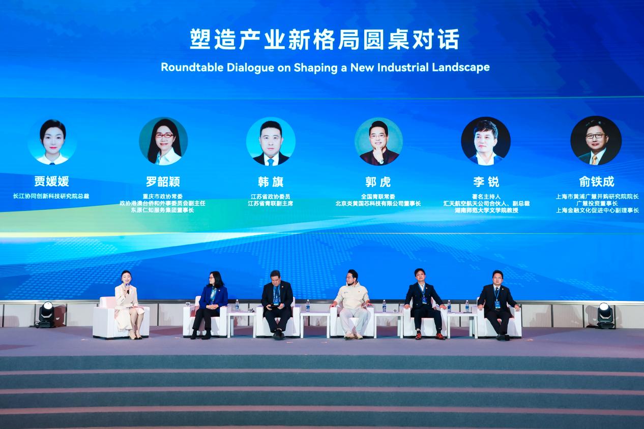 在塑造产业新格局主题圆桌对话环节,重庆市政协常委、港澳台侨和外事委员会副主任罗韶颖,全国青联常委、北京炎黄国芯科技有限公司董事长郭虎,江苏省青联副主席韩旗,著名主持人、湖南师范大学文学院教授李锐,上海市黄浦广慧并购研究院院长俞铁成分别围绕实业承载、科技驱动、规则保障、传播破圈、资本加速等议题开展深入交流。